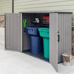 - Открывающаяся крышка и створки подходит для хранения габаритного, тяжелого инвентаря в загородном хозяйстве. Удобны для использования в качестве эстетичного хранения мусорных контейнеров, газовых баллонов, дров, барбекю, газонокосилок, велосипедов, хозинвентаря и т.д.
