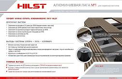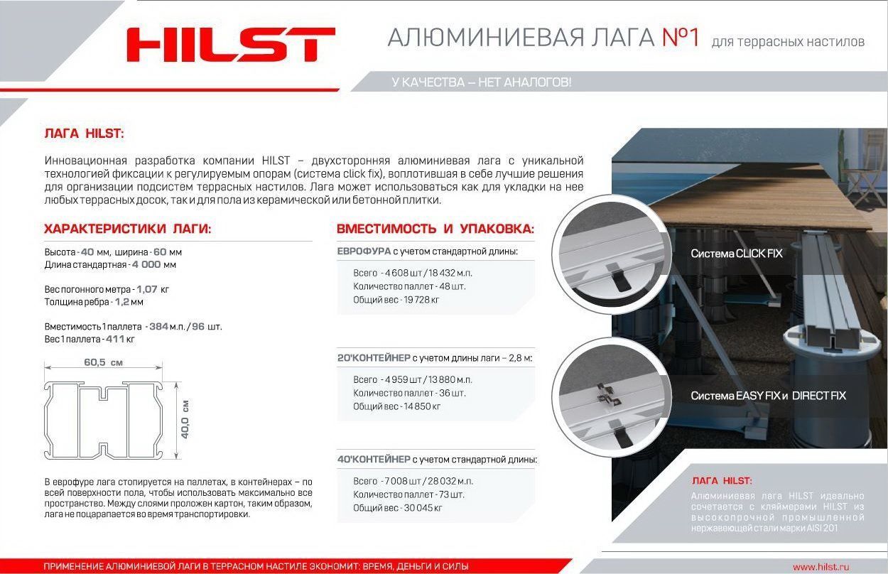 - Инновационная совместная разработка компании Гардек и Итальянского ведущего производителя регулируемых опор Eternoivica - алюминиевая лага с уникальной системой фиксации (не требующей крепежа) к регулируемым опорам и системой фиксации террасных досок с помощью специального металлического кляймера не требующего самореза. Алюминиевая лага HILST поможет Вам без труда и забот сделать террасный настил в загородном доме, коттедже или садовом участке. Алюминиевая лага HILST идеально сочетается с кляймерами HILST из высокопрочной промышленной нержавеющей стали марки AISI 201.